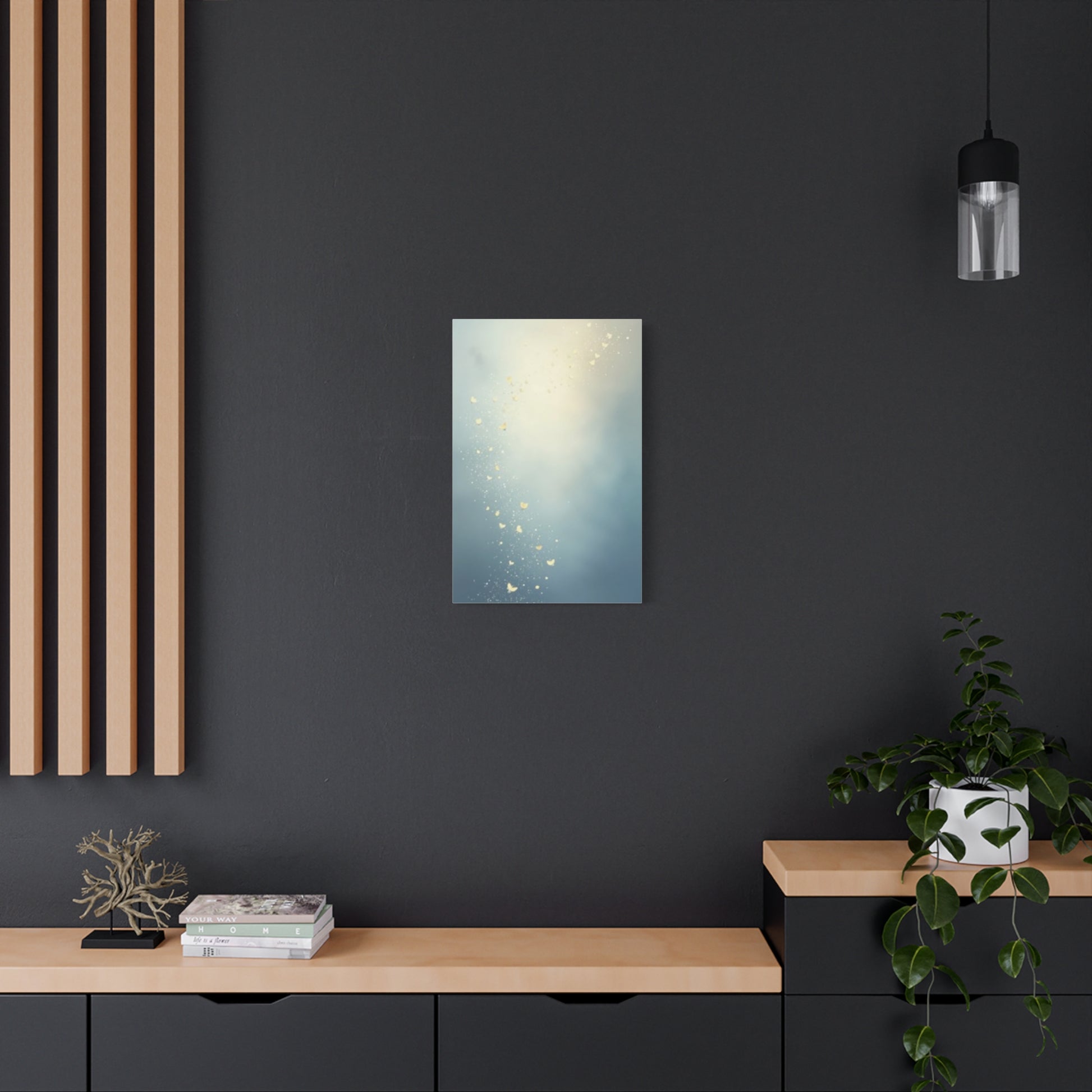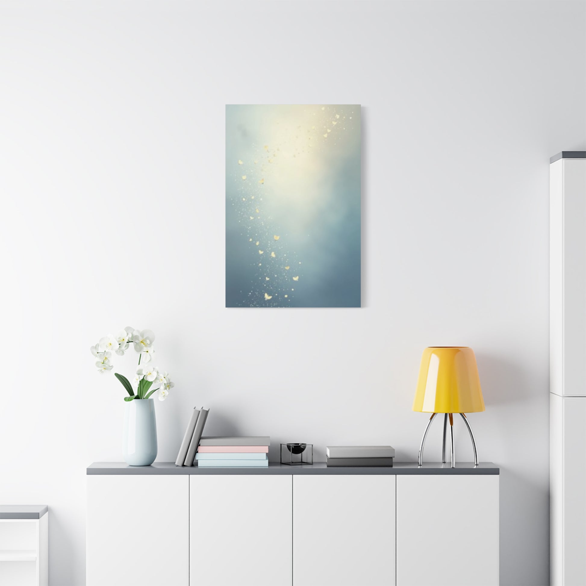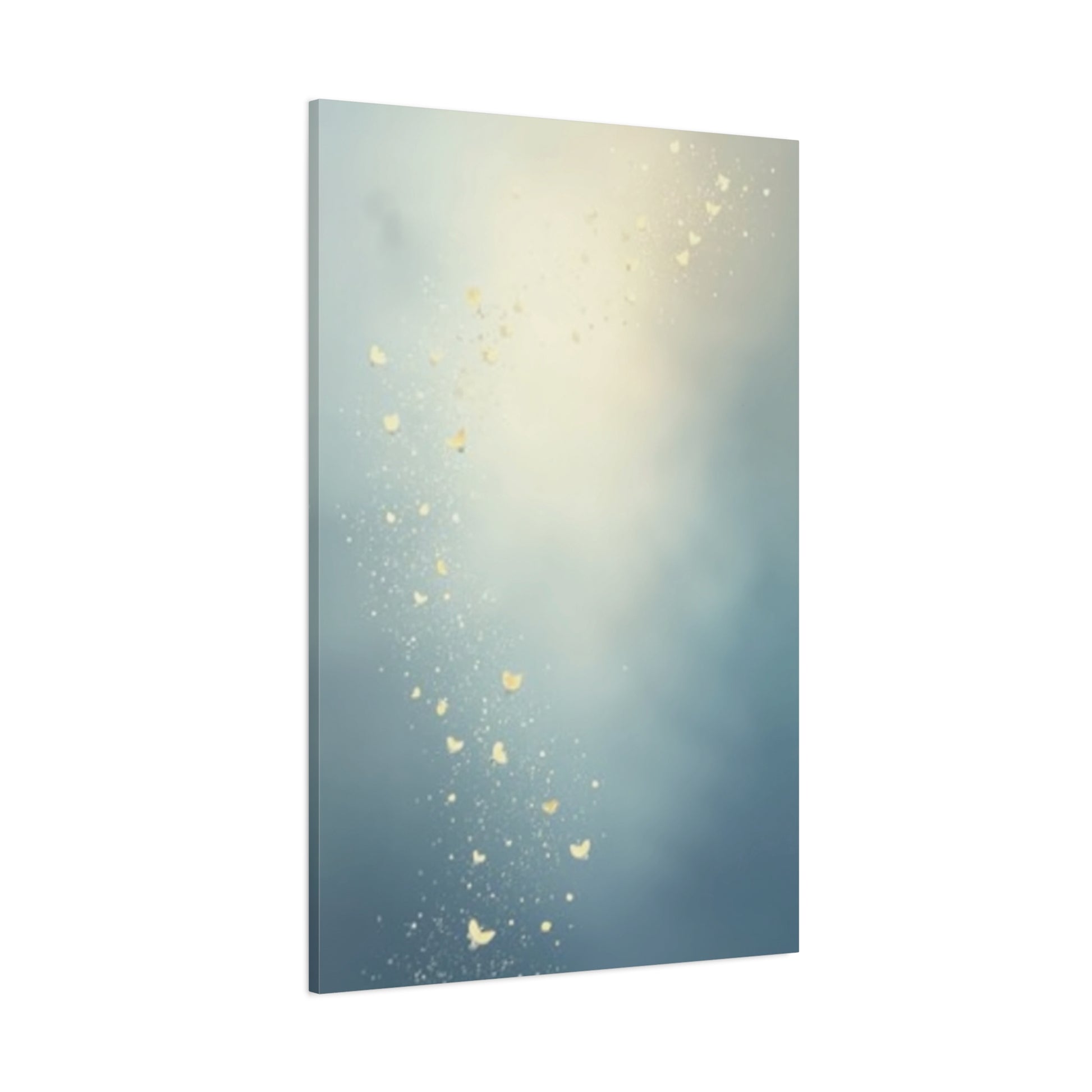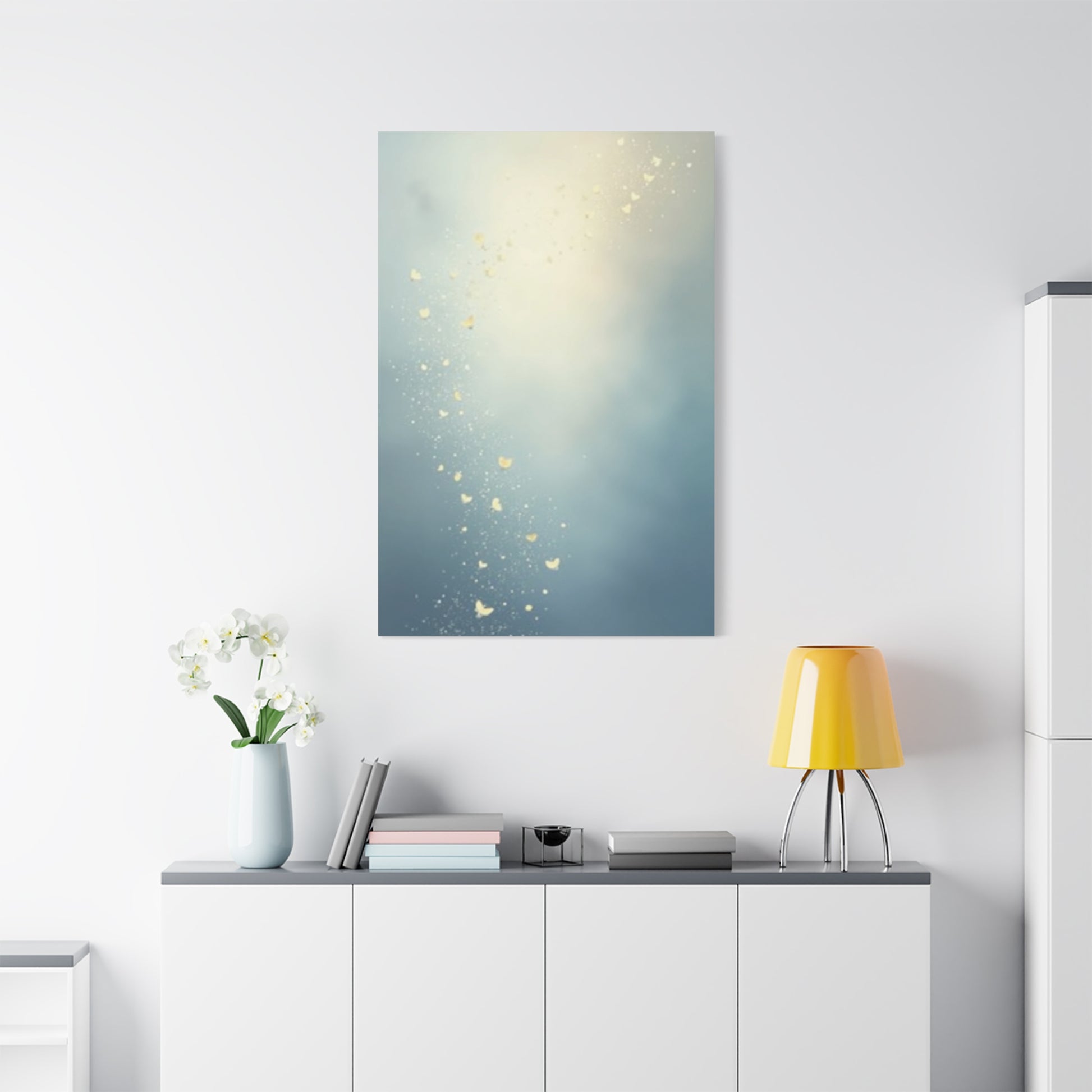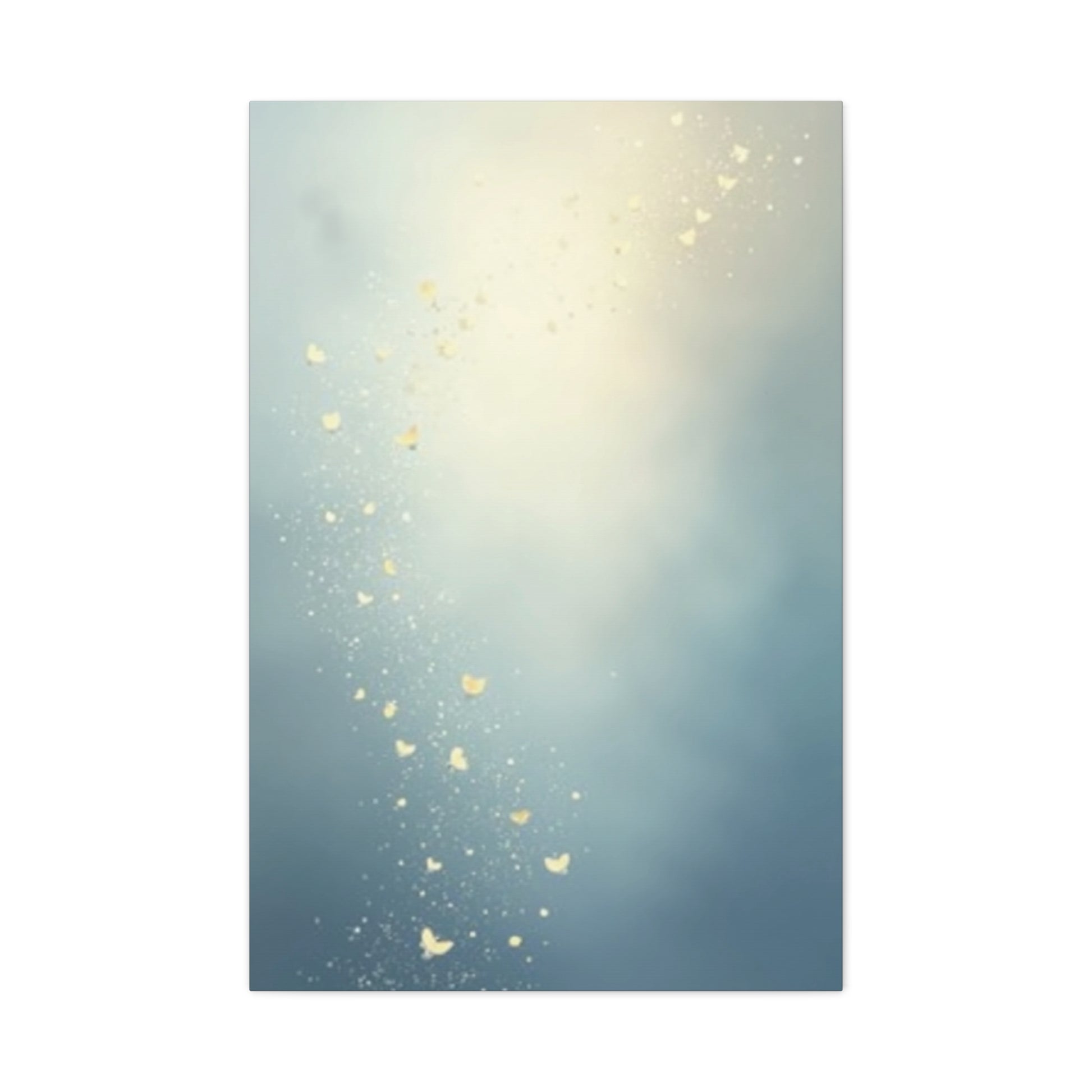Immerse yourself in its airy, soft-focus background, where a blended wash of pale blue and muted cloud gray creates a sense of open space. Across this serene canvas, a scattered array of small, softly luminous specks in whisper-white and muted yellow drift gently upwards. Each floating element is a quiet promise of future growth, rendered with a painterly touch that feels both delicate and hopeful.