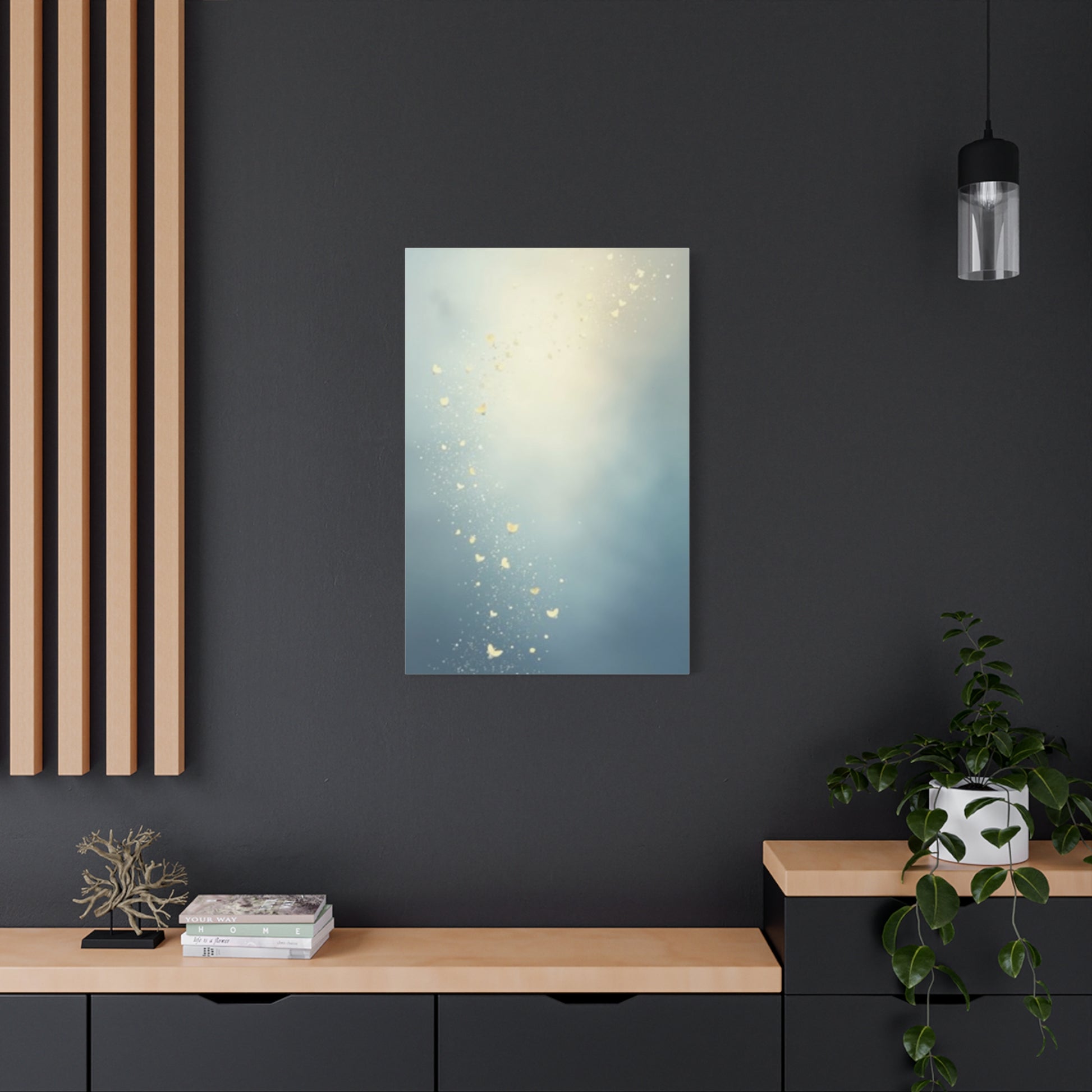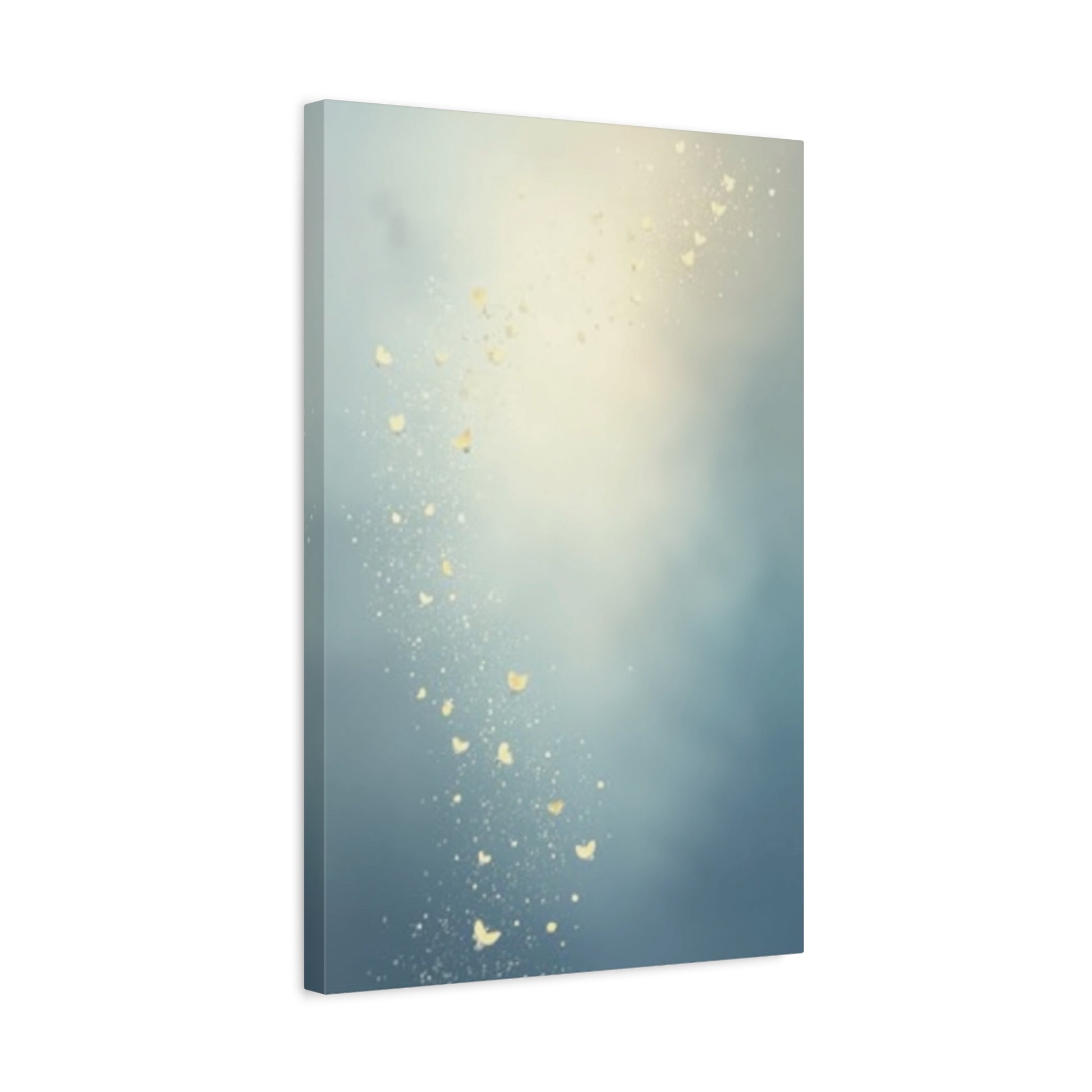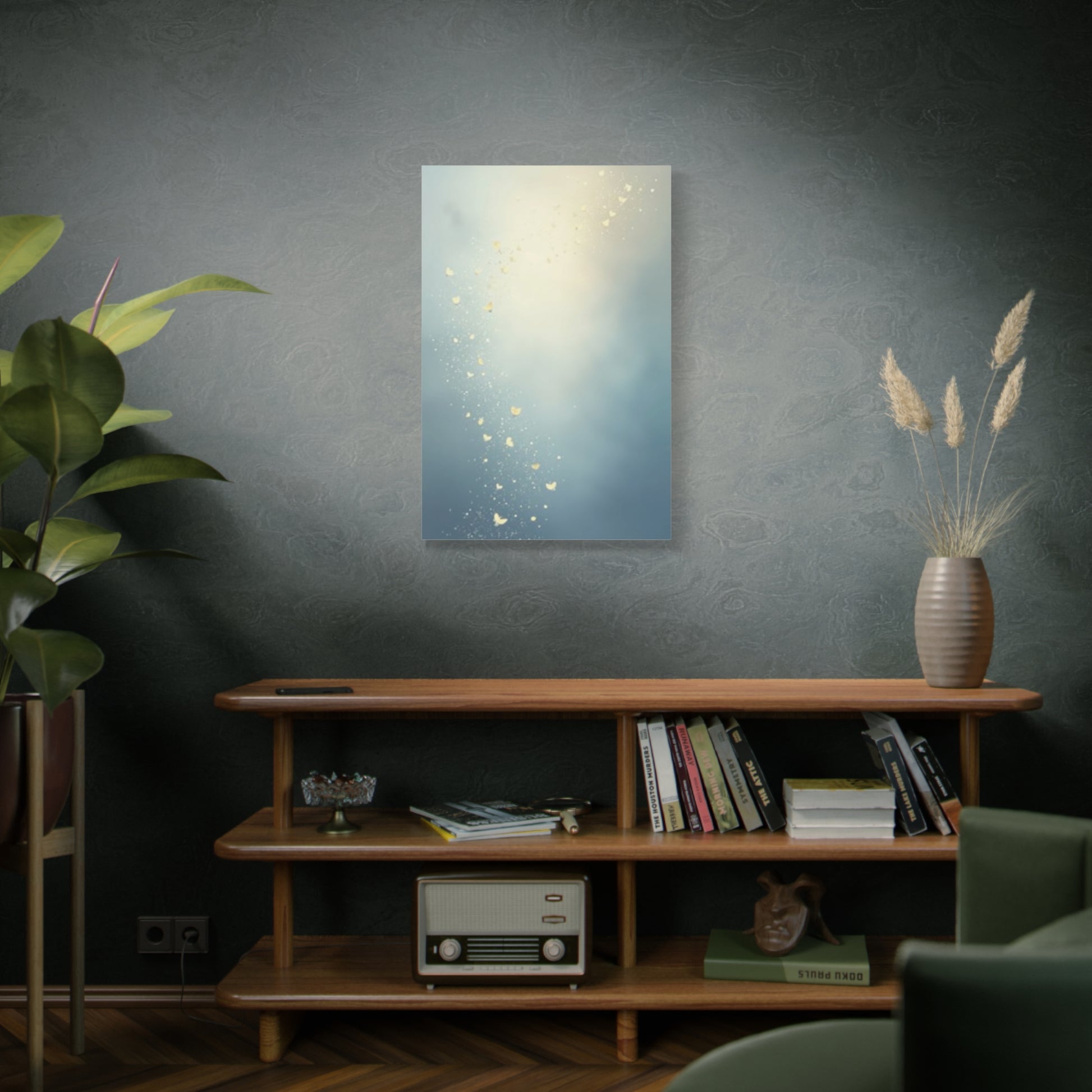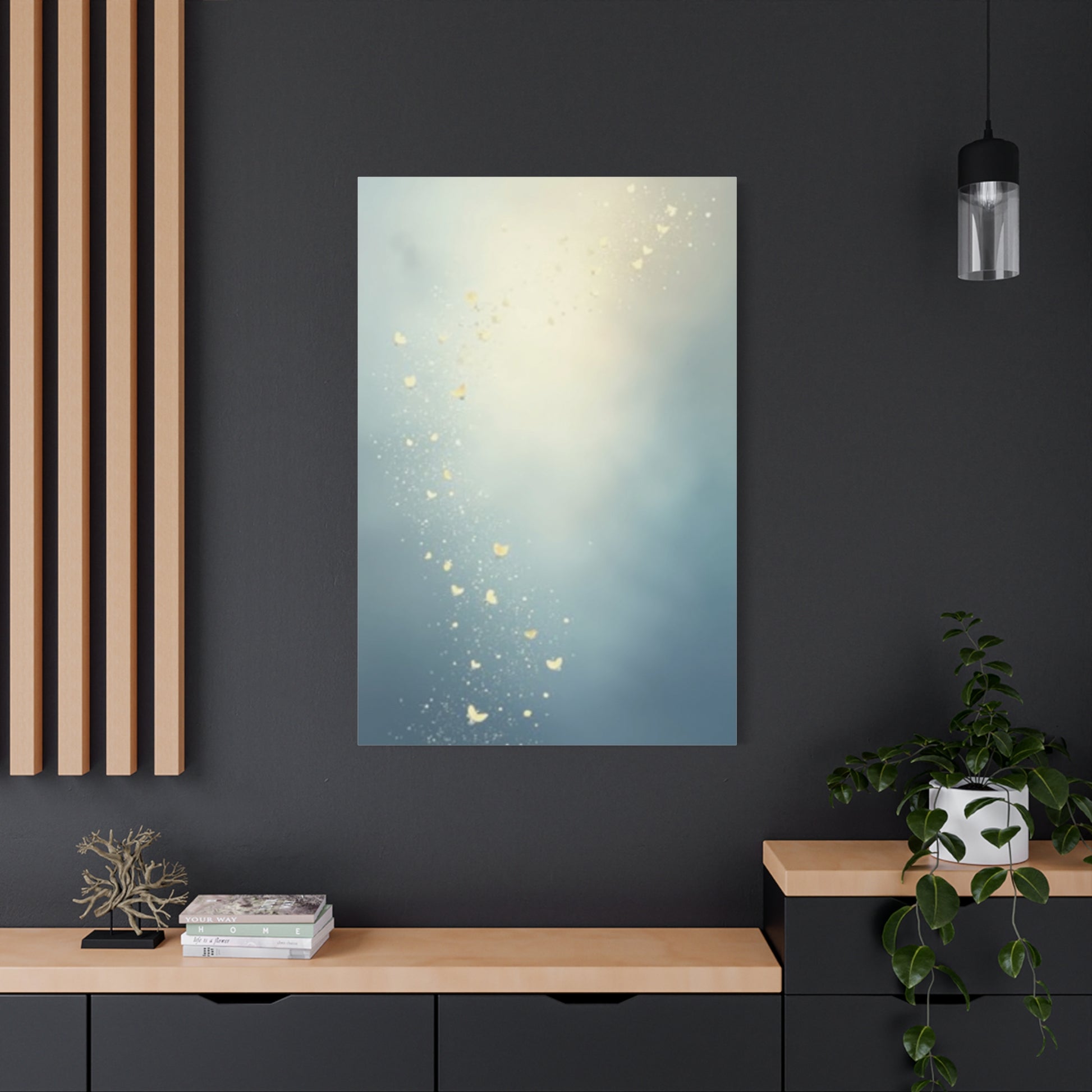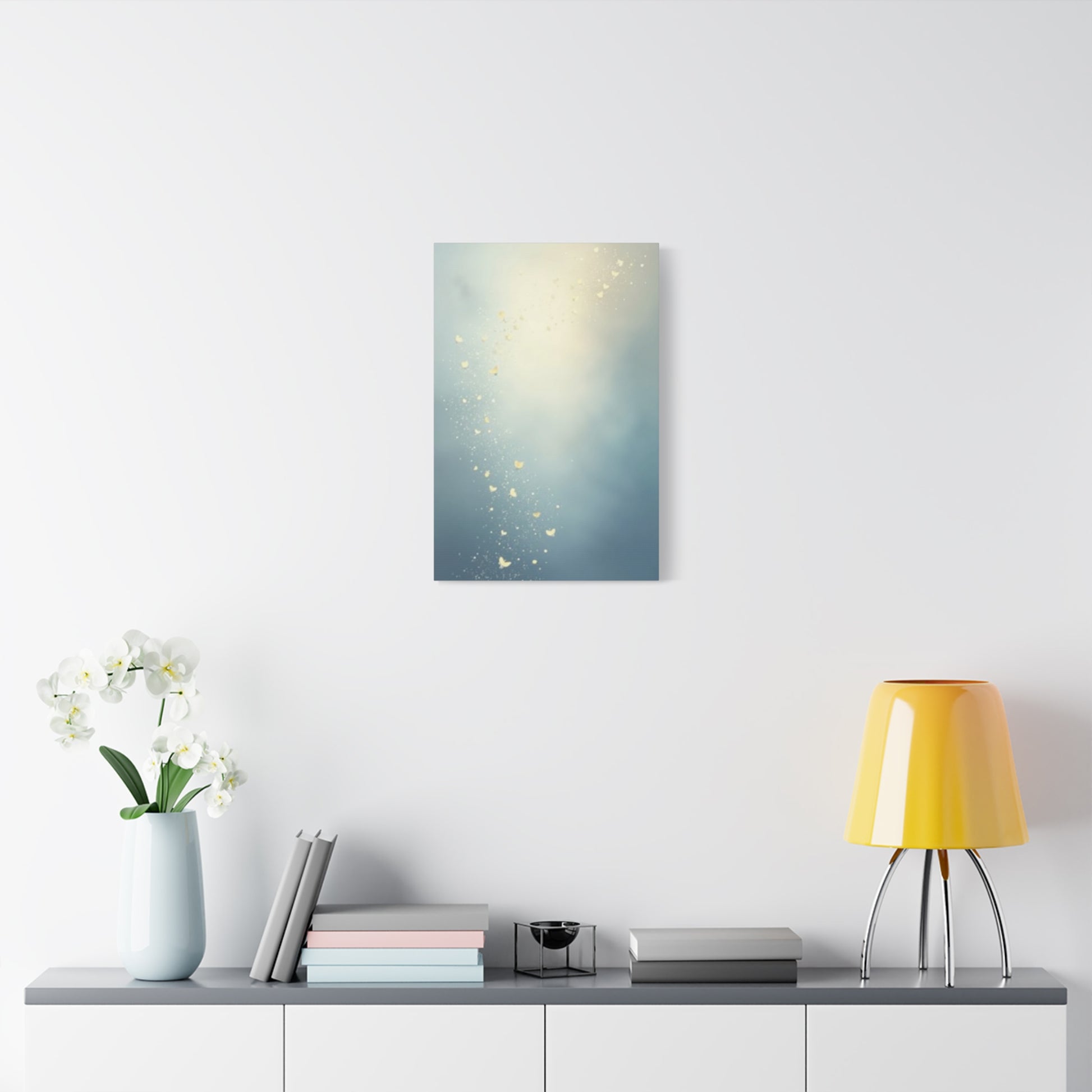 Immerse yourself in its airy, soft-focus background, where a blended wash of pale blue and muted cloud gray creates a sense of open space. Across this serene canvas, a scattered array of small, softly luminous specks in whisper-white and muted yellow drift gently upwards. Each floating element is a quiet promise of future growth, rendered with a painterly touch that feels both delicate and hopeful.