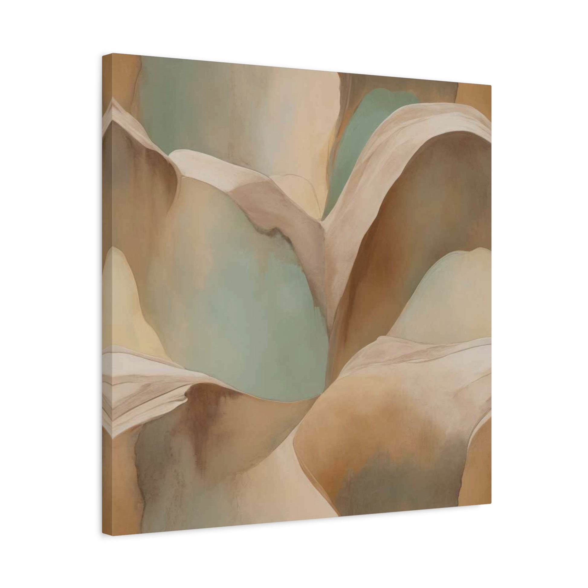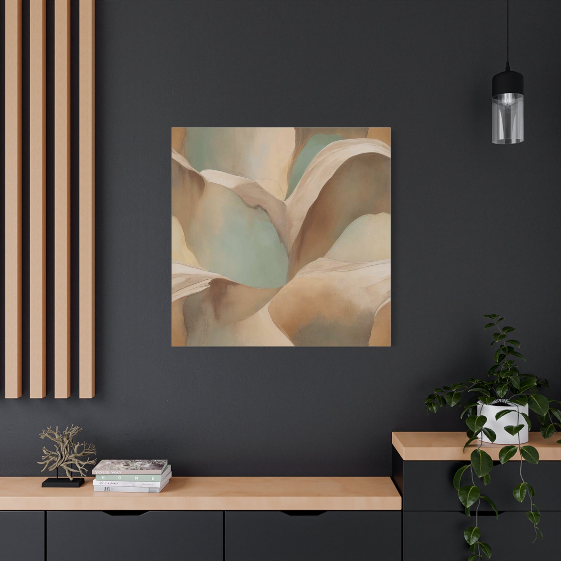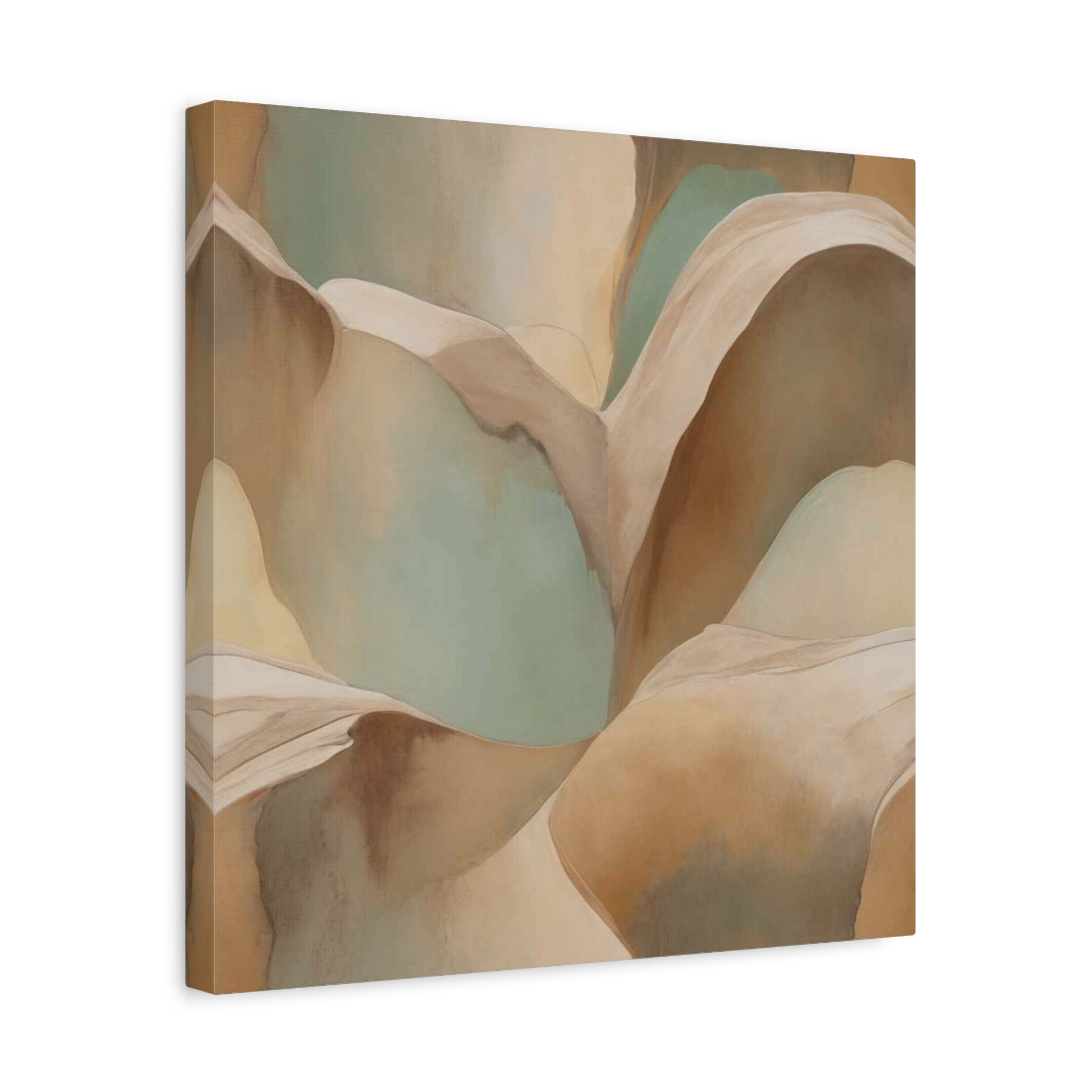 Immerse yourself in its composition of large, overlapping, and gently rounded forms. A warm and earthy palette of sandy beige, rich ochre, and pale sage green blend seamlessly, their soft, blurs edges creating a profound sense of depth and gentle shadow. The style is painterly and atmospheric, evoking the feeling of a vast, tranquil canyon without a single literal line.
