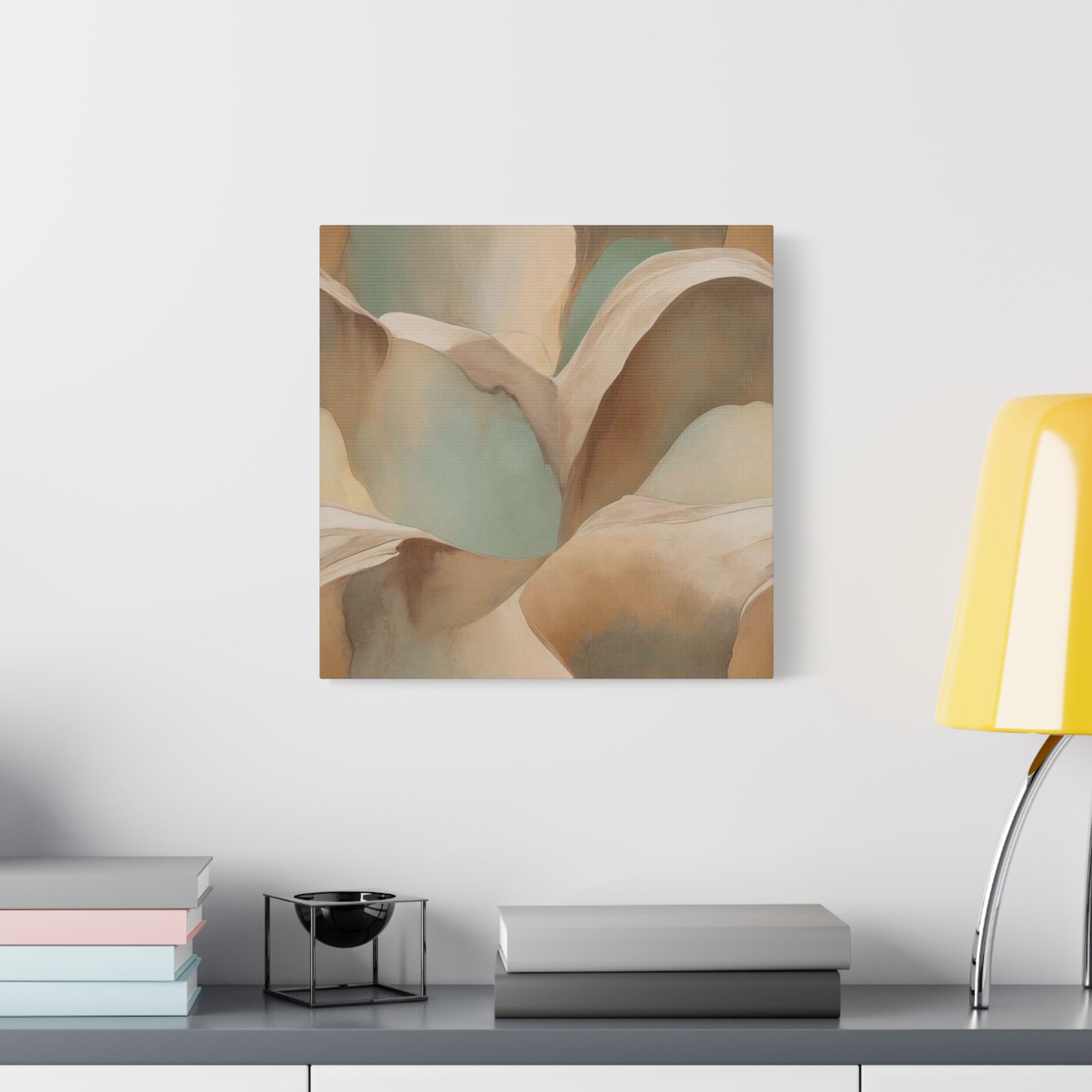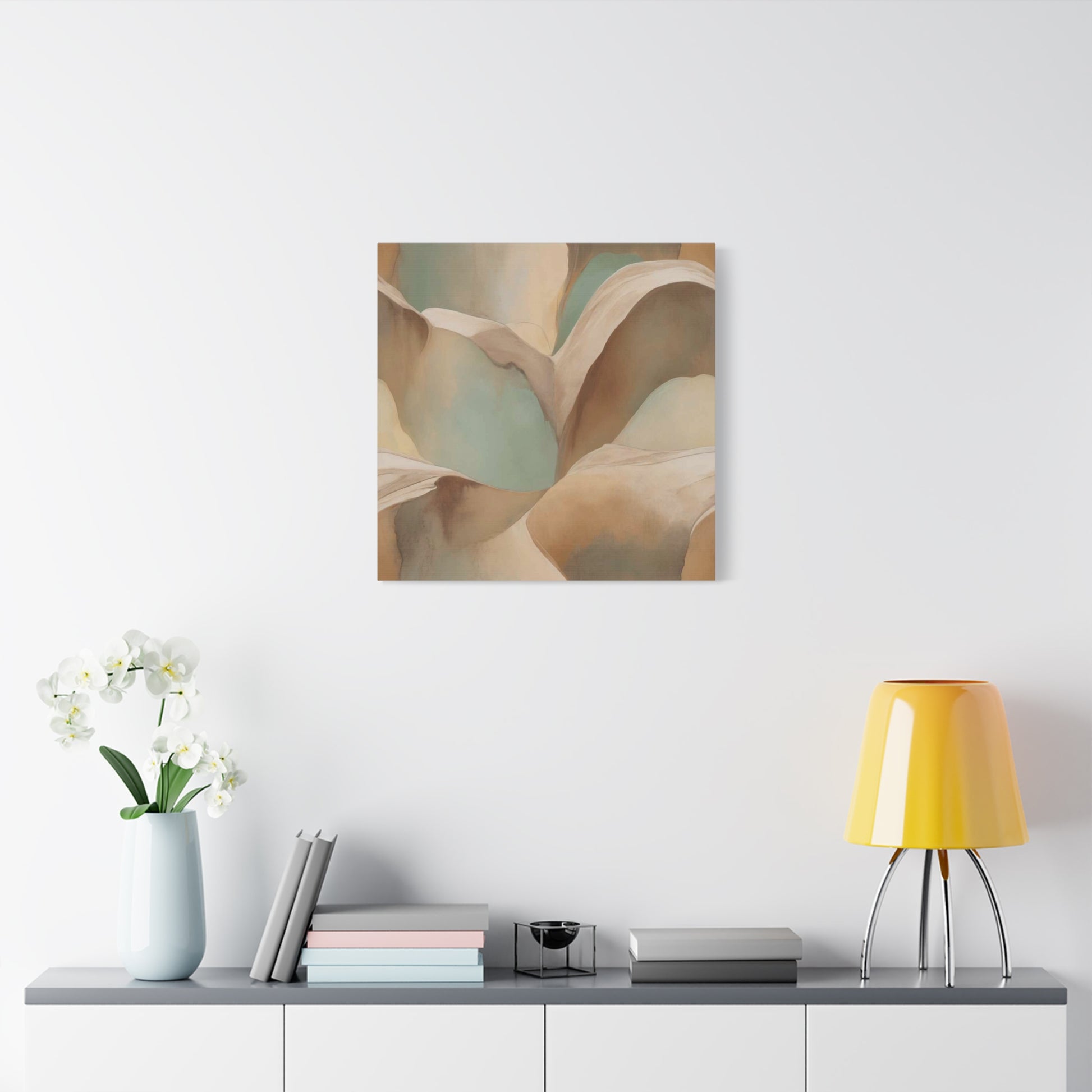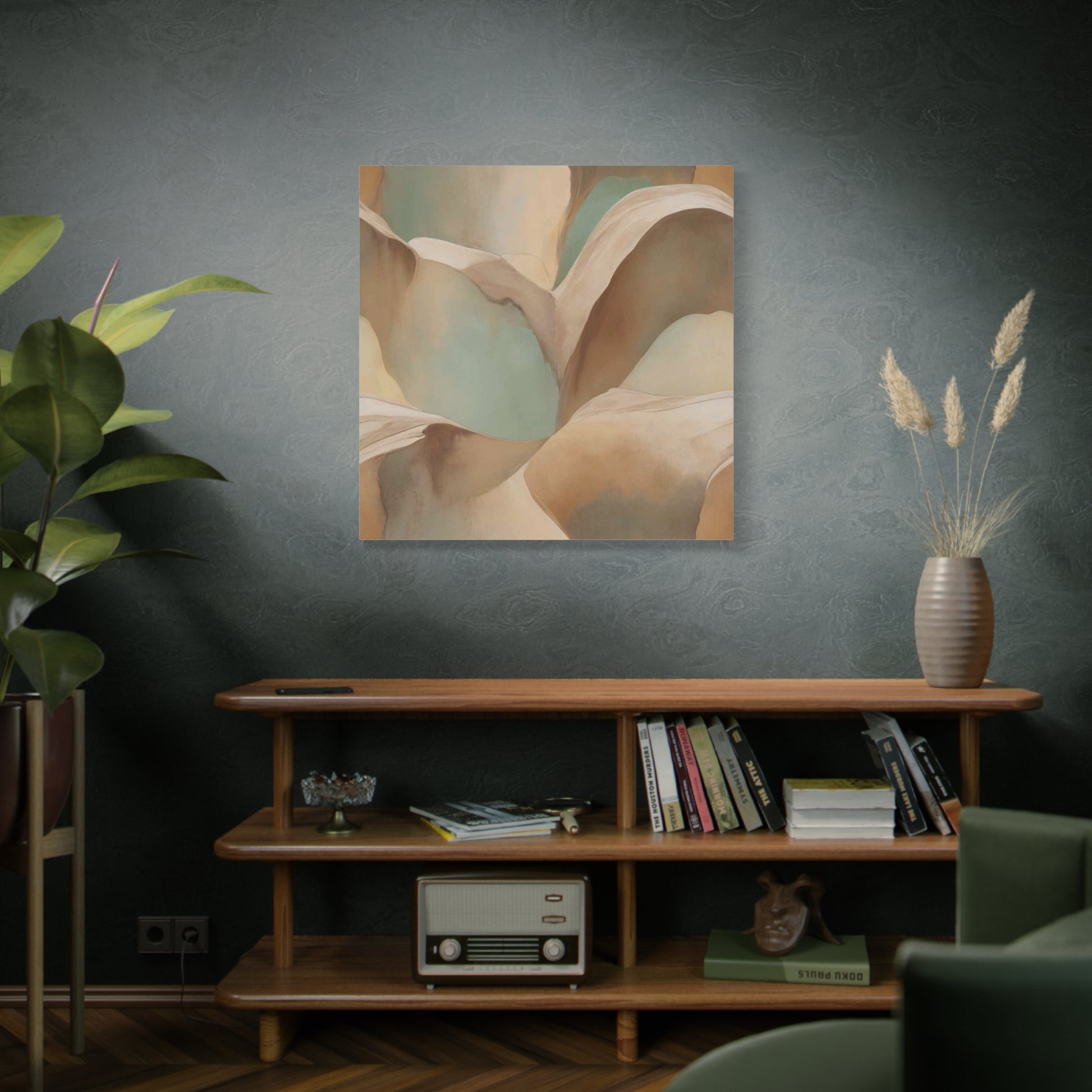 Immerse yourself in its composition of large, overlapping, and gently rounded forms. A warm and earthy palette of sandy beige, rich ochre, and pale sage green blend seamlessly, their soft, blurs edges creating a profound sense of depth and gentle shadow. The style is painterly and atmospheric, evoking the feeling of a vast, tranquil canyon without a single literal line.