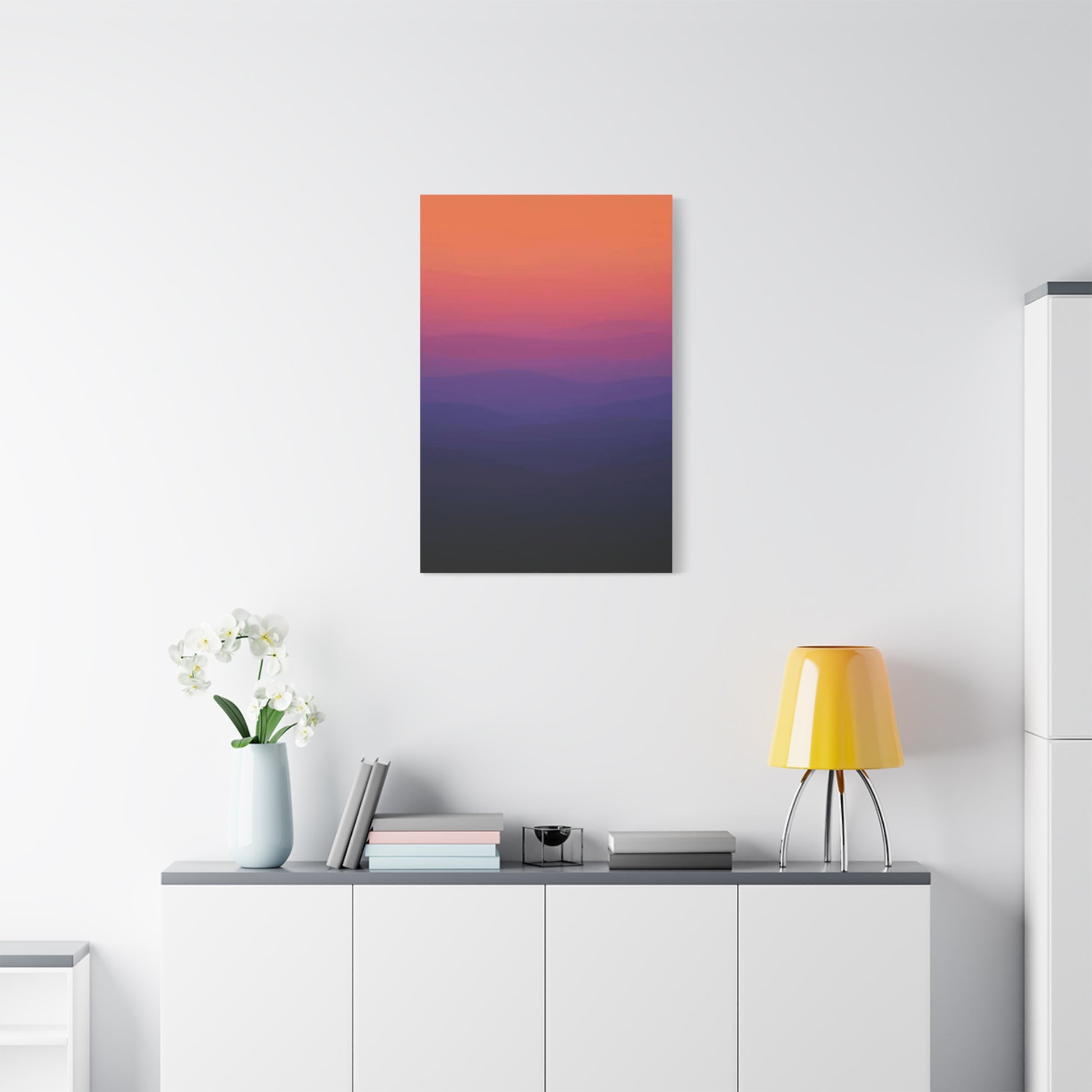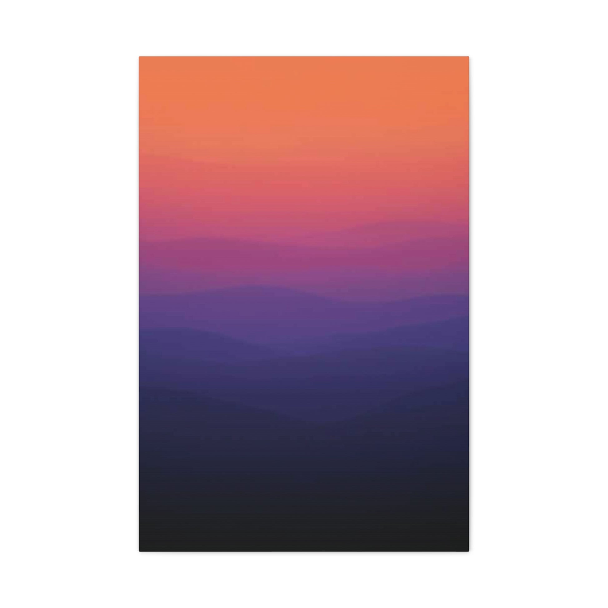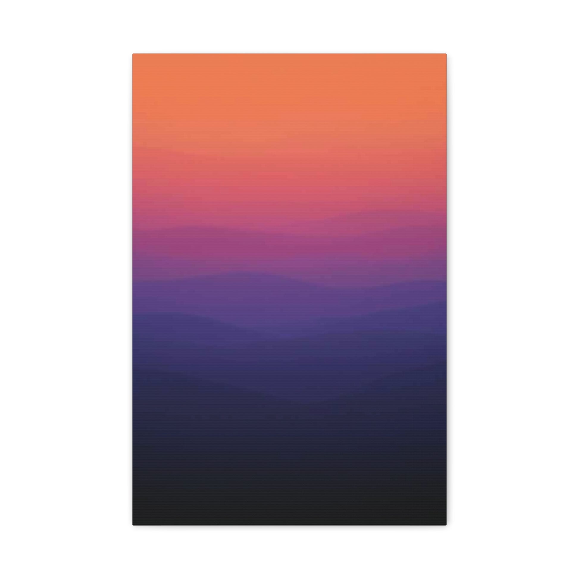 Immerse yourself in its stunning, atmospheric composition. With no shape or lines, the focus is entirely on the soft, horizontal gradient color. A faded, warm terracotta orange from the top of the camvas seamlessly bleeds downwards through a muted rose, transitioning into a deep, rich indigo, and finally resting in a near-black at the bottom. The effect is a smooth, painterly wash of pure, emotive color.