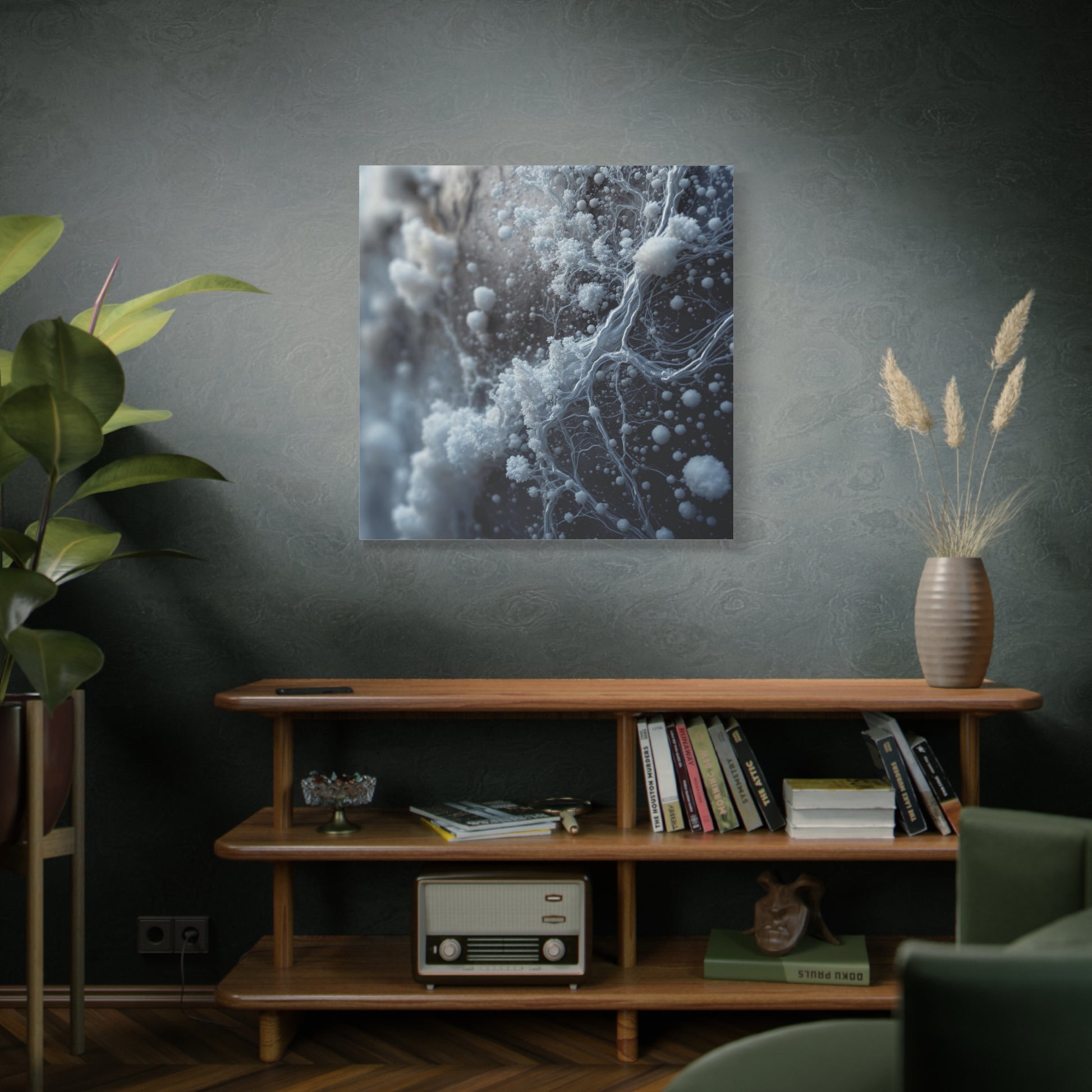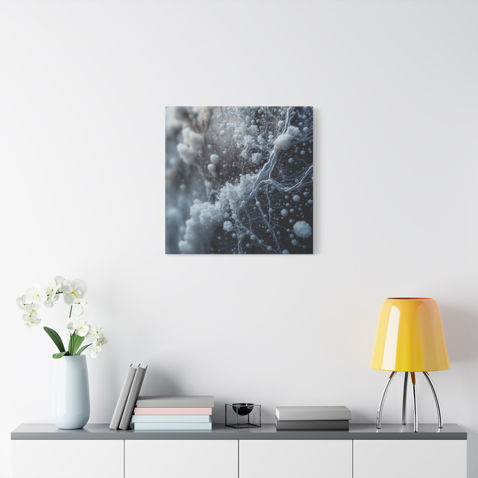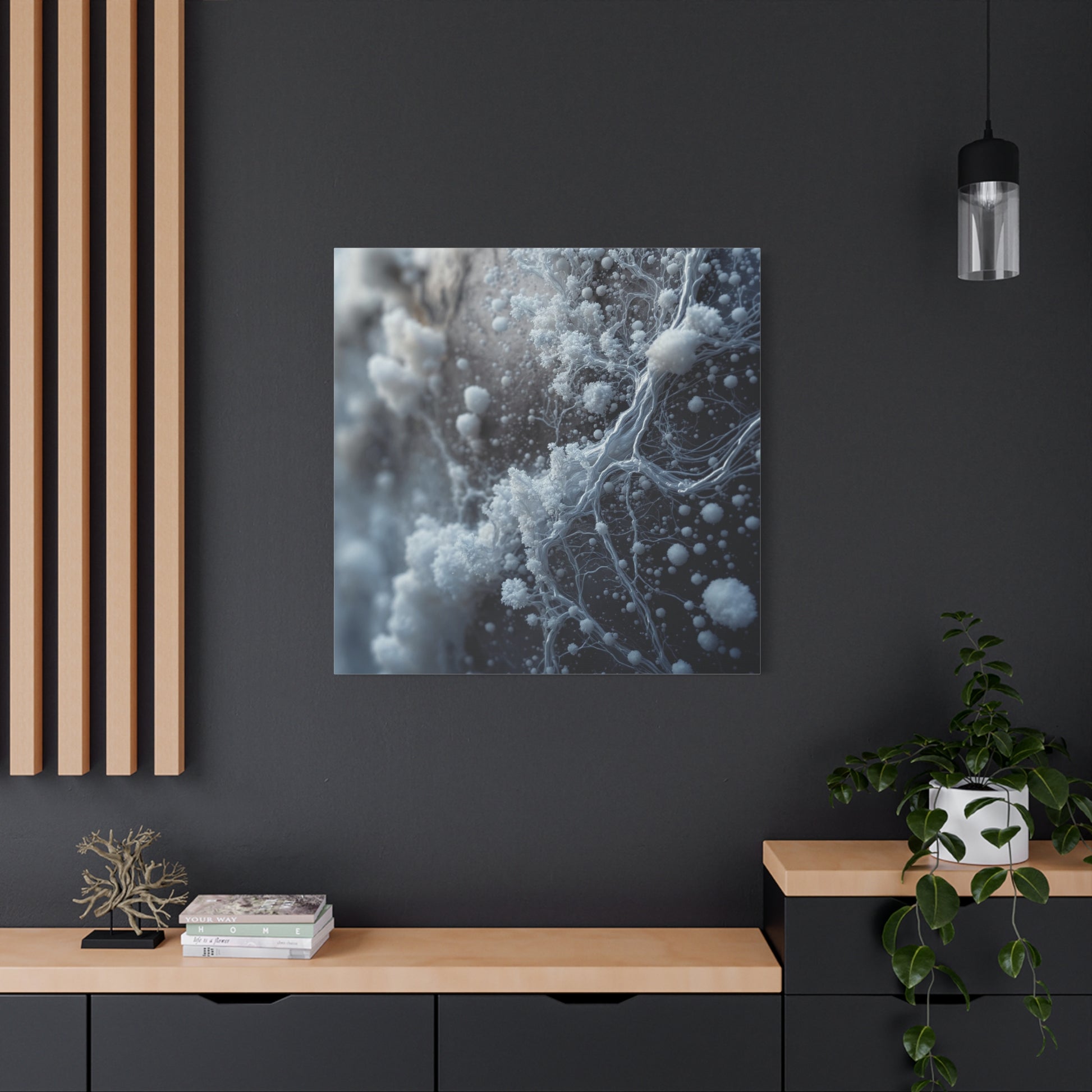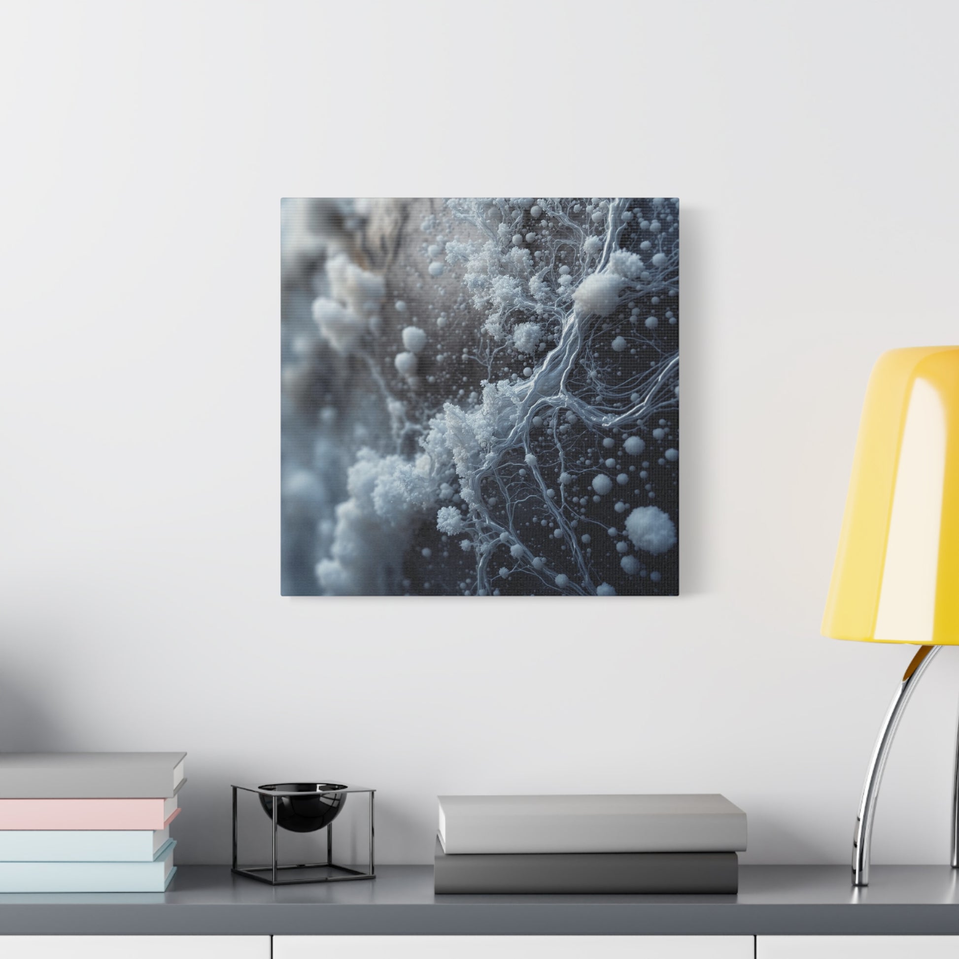 Immerse yourself in its stunning, macro composition. A network of delicate, fractal-like structures in brilliant off-white and pale silver seems to grow and climb across a deep, muted background, creating a powerful sense of depth and organic complexity. The shallow depth of field draws your eye to the sharpest, most intricate detail, giving the piece a tangible, almost three-dimesnional quality.