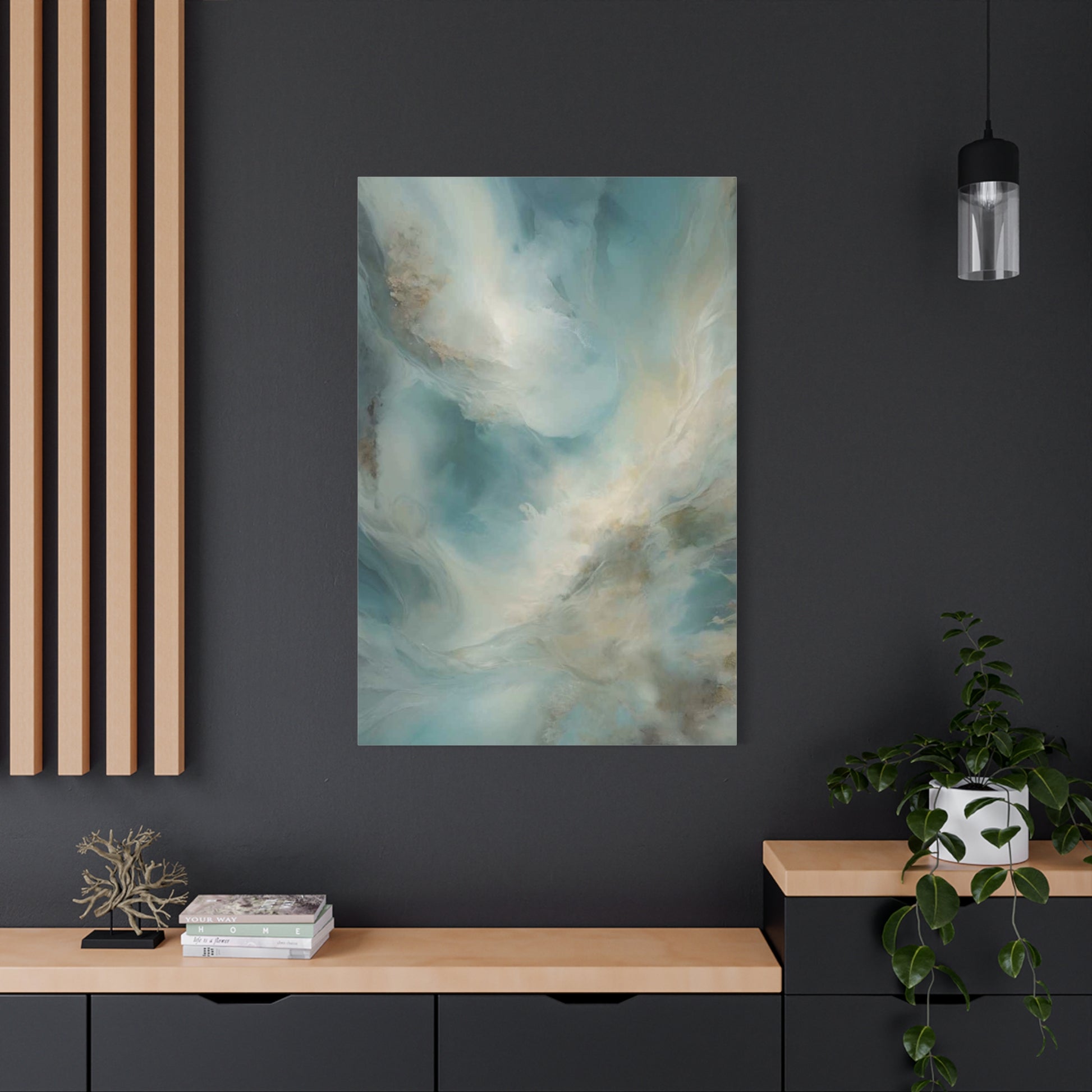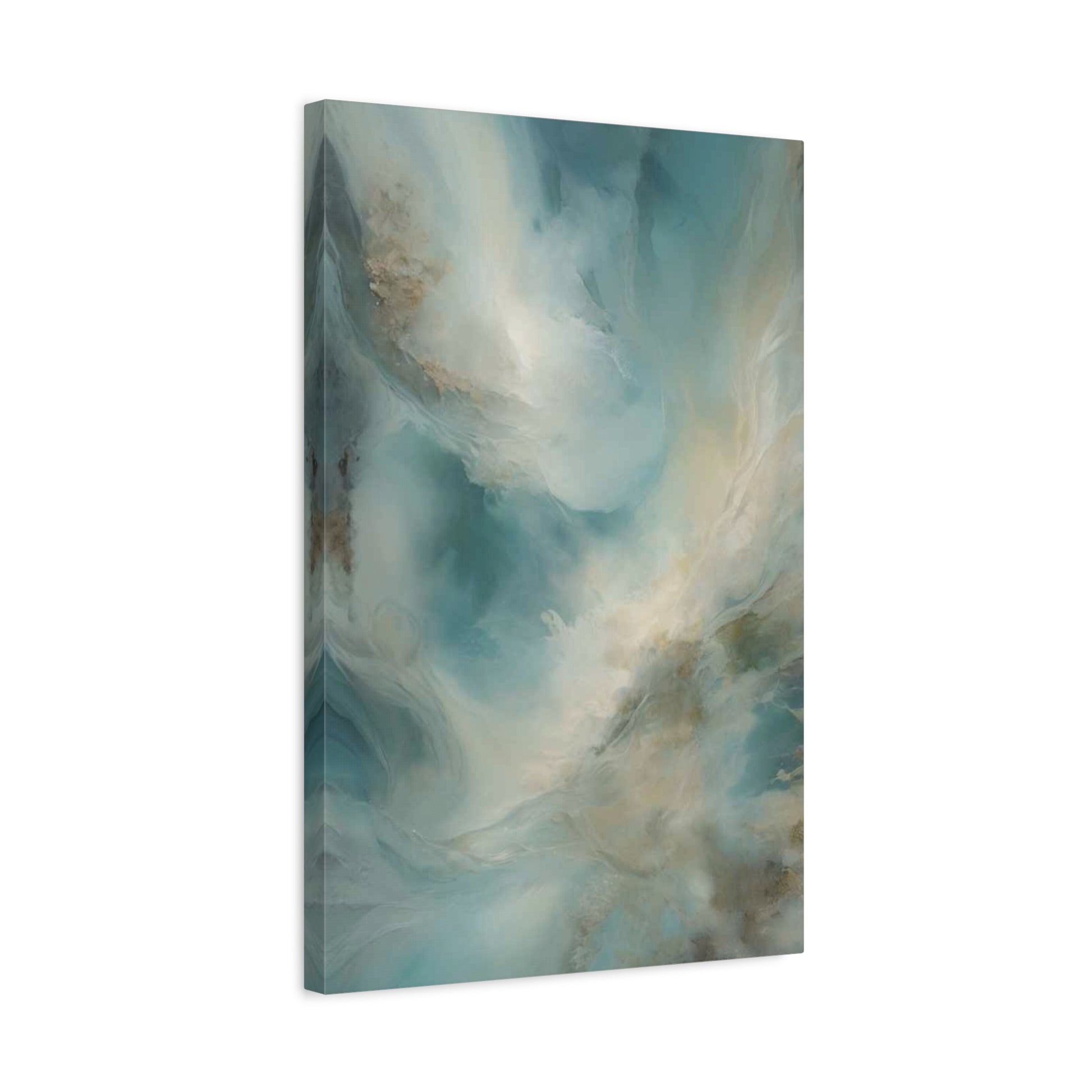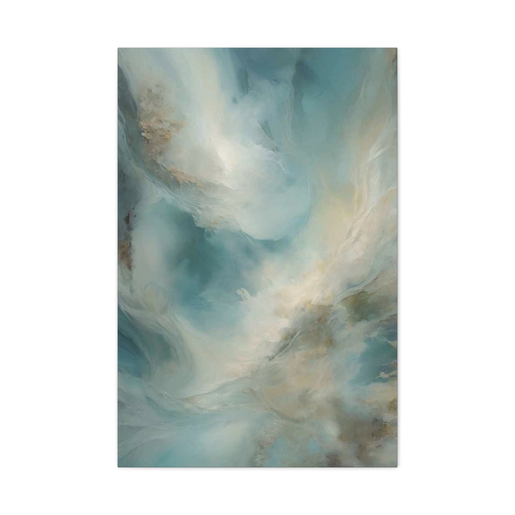 Immerse yourself in its deep, atmospheric composition. Soft, translucent forms of watery blue, muted teal, and pale sage green float and overlap, blending seamlessly into one another. Luminous areas of creamy off-white emerge from within, giving the piece a gentle, internal glow. The overall effect is fluid and mysterious, inviting the viewer to gaze deeper and find a moment of perfect peace.