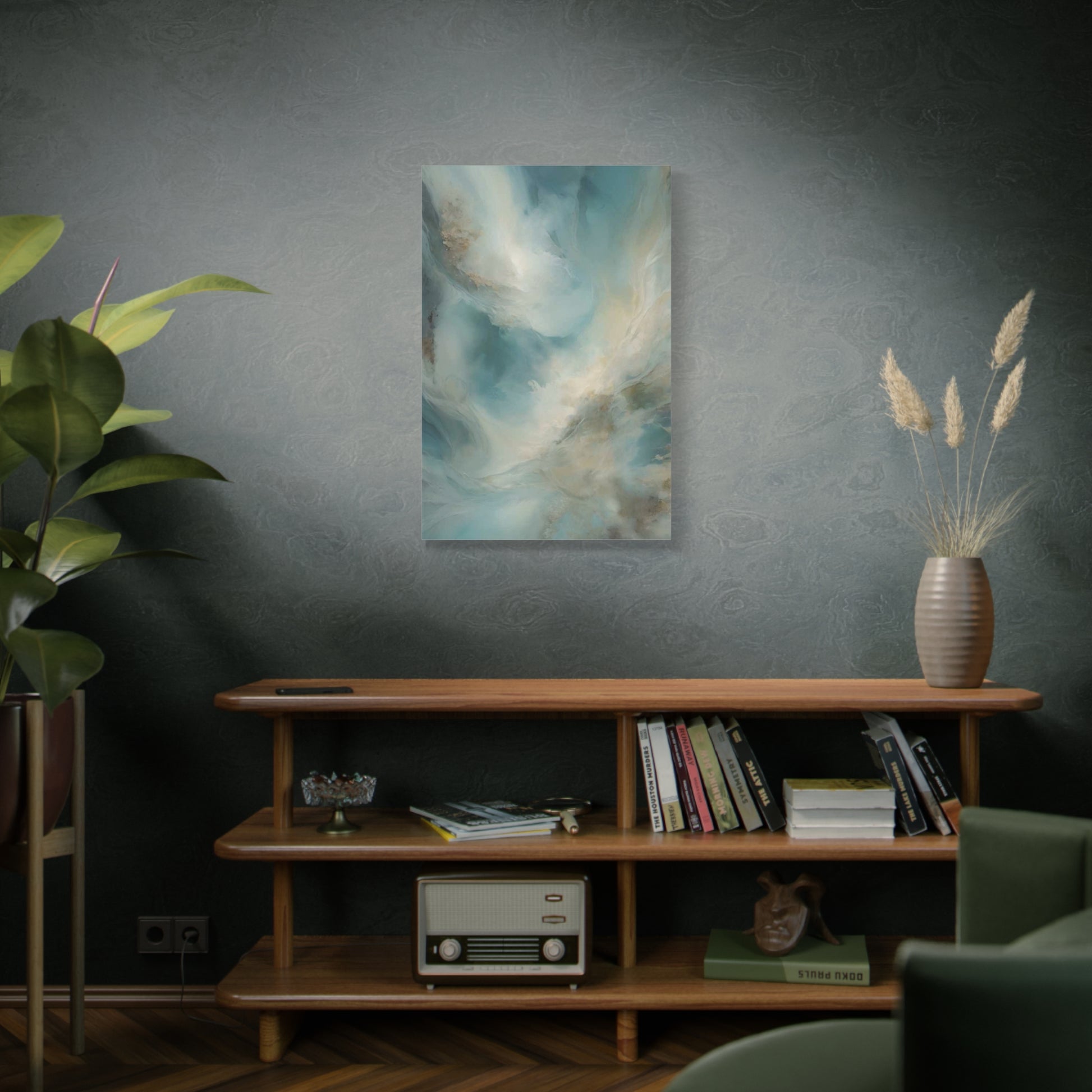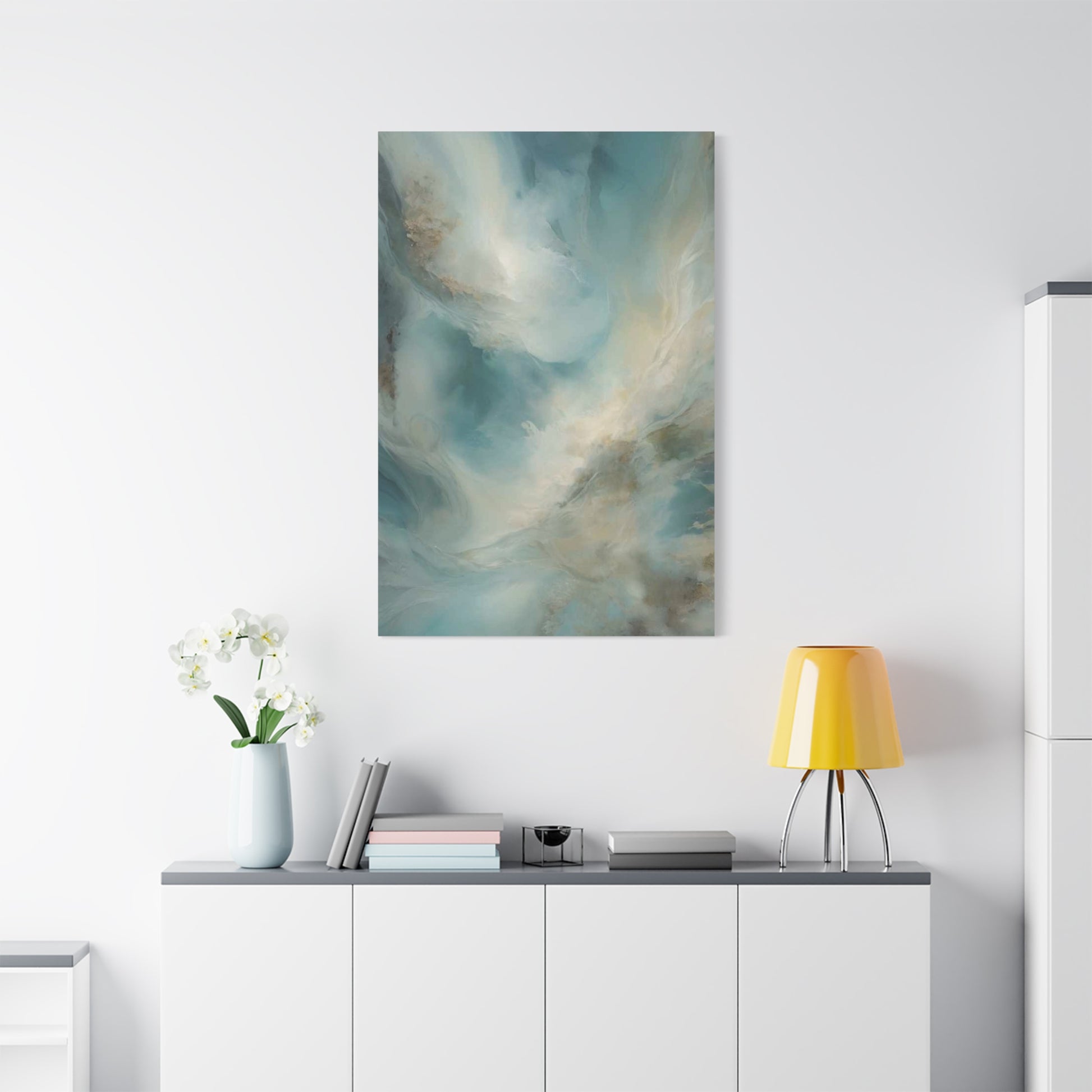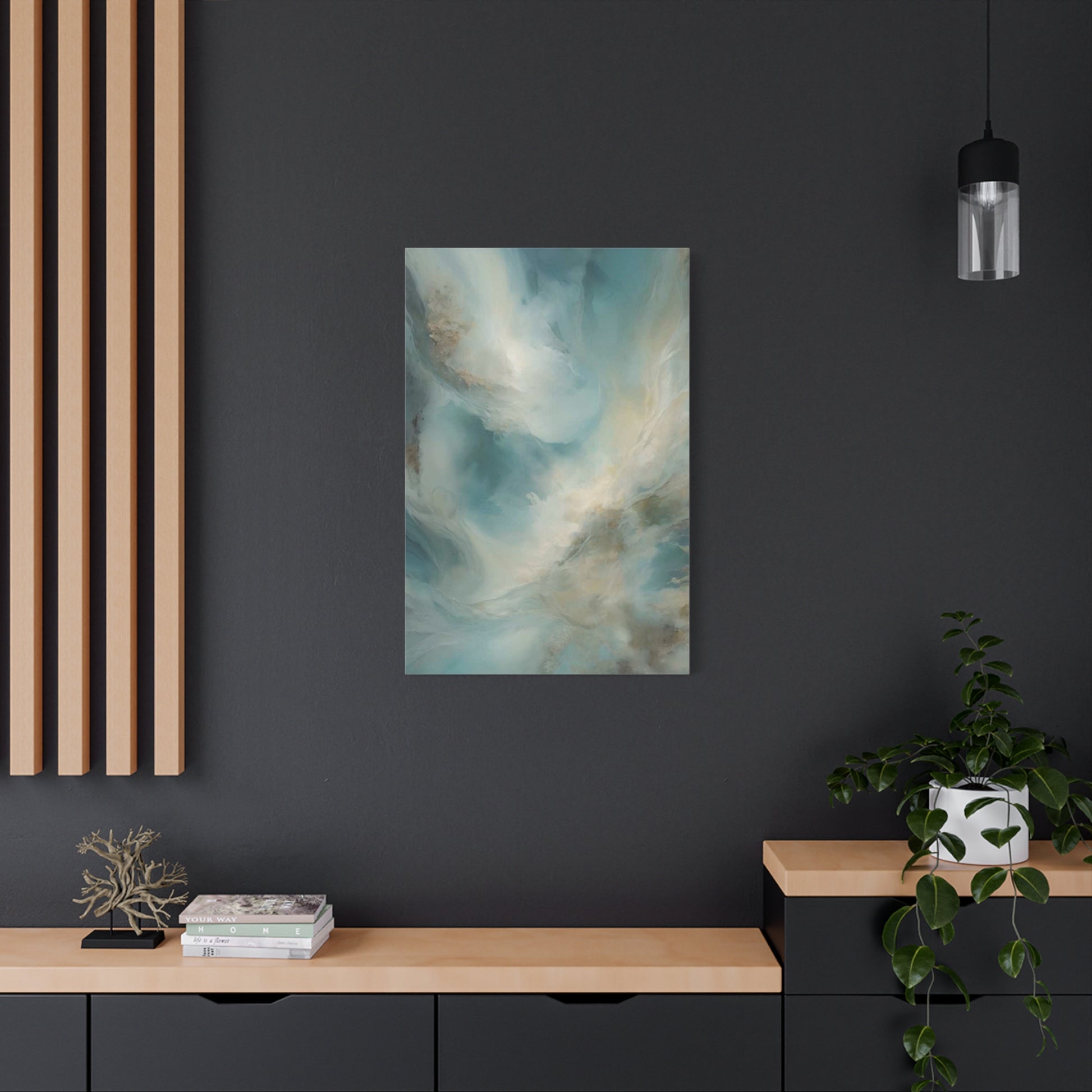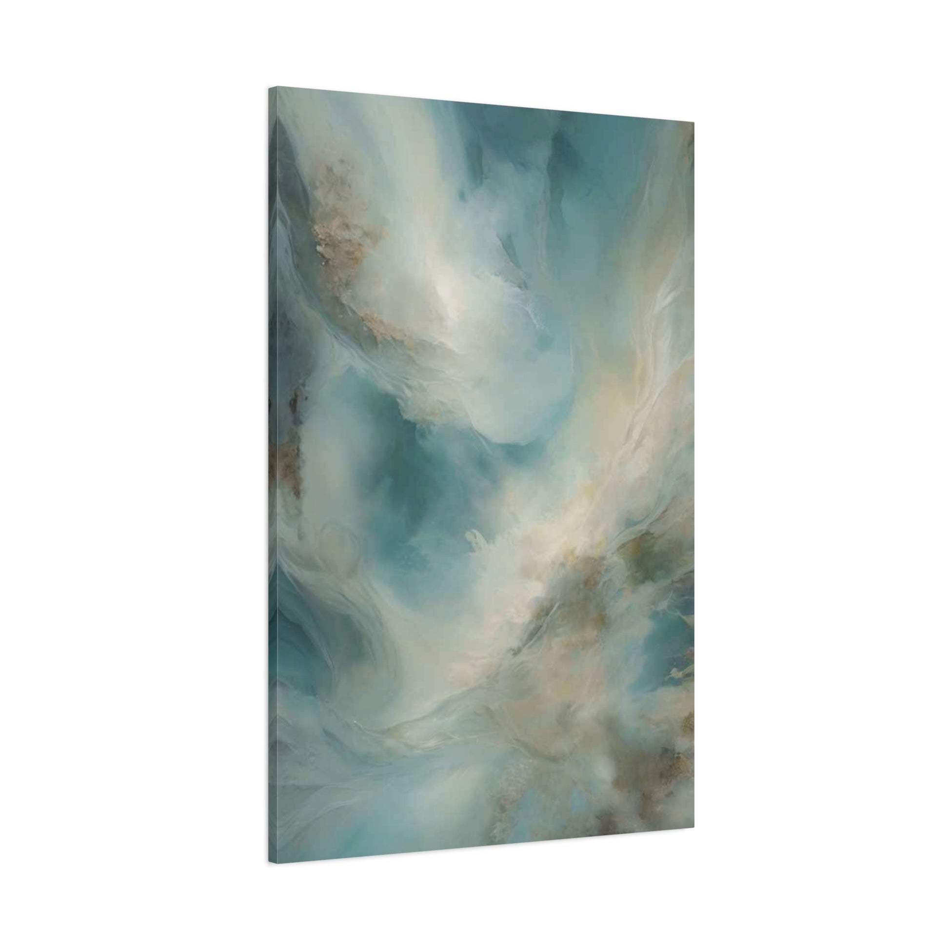 Immerse yourself in its deep, atmospheric composition. Soft, translucent forms of watery blue, muted teal, and pale sage green float and overlap, blending seamlessly into one another. Luminous areas of creamy off-white emerge from within, giving the piece a gentle, internal glow. The overall effect is fluid and mysterious, inviting the viewer to gaze deeper and find a moment of perfect peace.